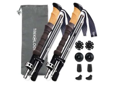 Folding hiking poles (set of 2 poles) feature adjustable lengths, durable METAL FLIP-LOCK, strong 7075 aluminum alloy construction, adjustable wrist strap, and sweat-absorbing cork grips. Each pole is lightweight (only 11.5oz, 330g) and collapsible to a 15'' (38cm) compact size and easily fits into a backpack.
