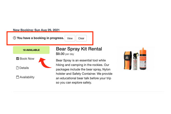 Step 3.Browse to the section of the website that has the next item you want to book, like the Bear Spray booking page for example. When you scroll down the page to add this item to you r booking, you will still see the " You have a booking in progress" notification.