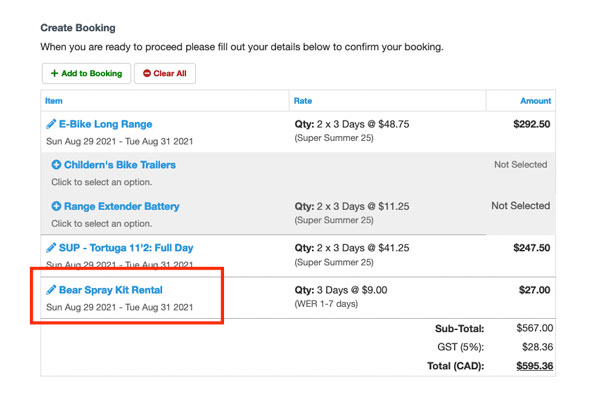 Example: Books bikes, paddleboards and bear spray under the same booking.